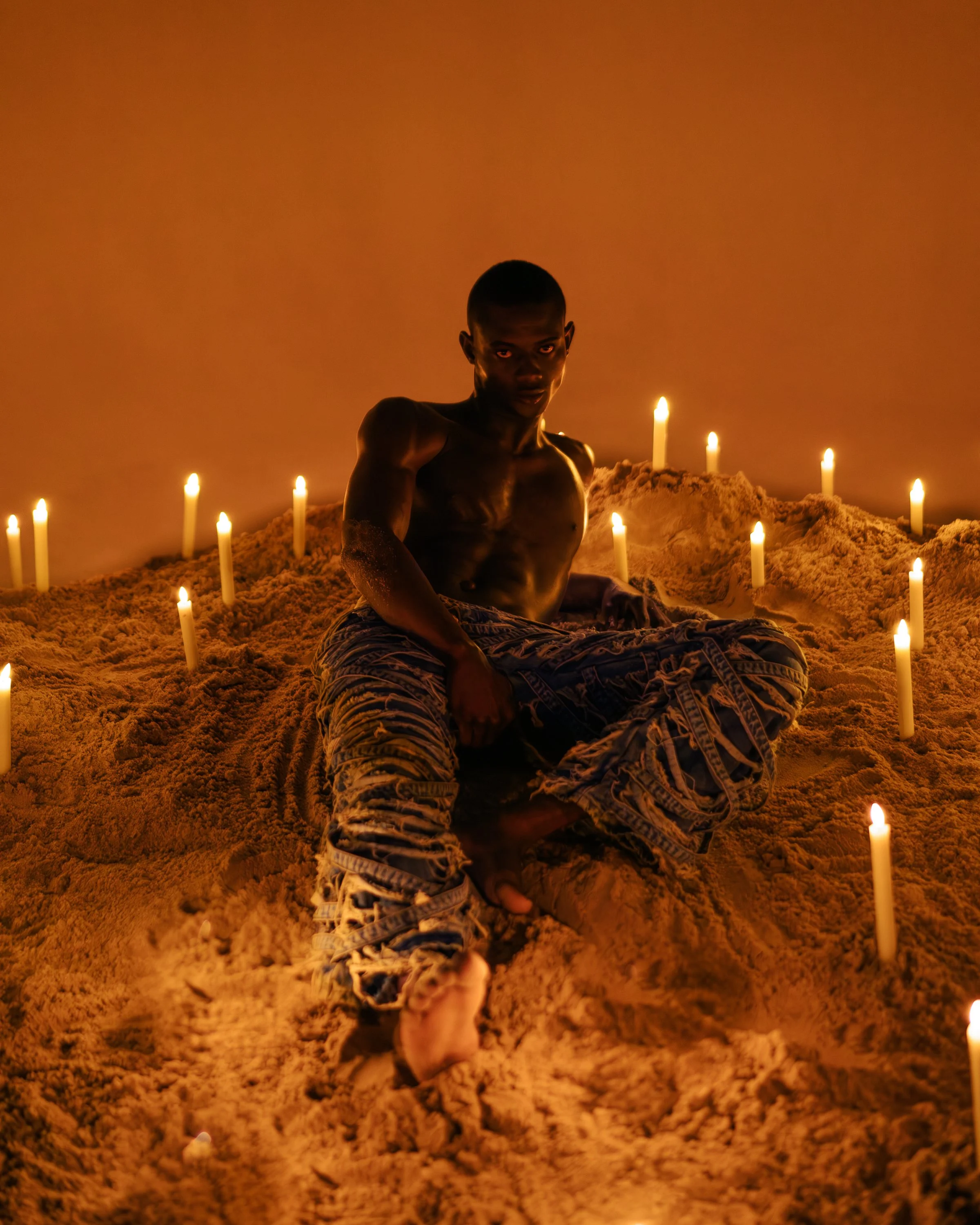Take Me 222 The Sun is a promotional and editorial shoot created for a unique distressed jeanncreated by brand What Happened To God and fashion designer Saturn Modi. Rose created an intimate yet dystopian desert scape using nearly two thousand pounds of sand in Brooklyn, NY to capture the essence of the brand of What Happened to God. Photographed by Sharmeen Chaudhary and Rus Diaz, the results are seductive stills blending both editorial and narrative visual styles.